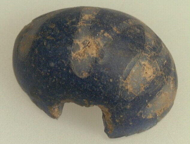 Perle ronde, bleu foncé, décorée d'une ligne en zig-zag plus claire et percée axialement.