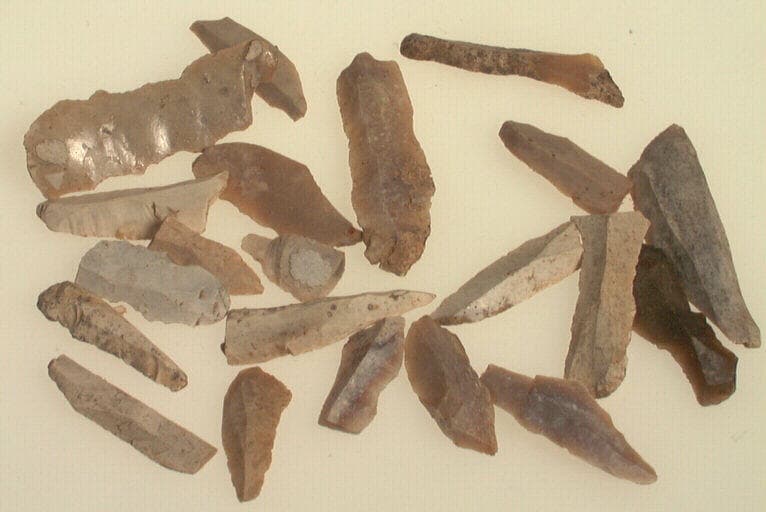 silex blanc et gris. ; Lamelles de silex de tailles diverses.