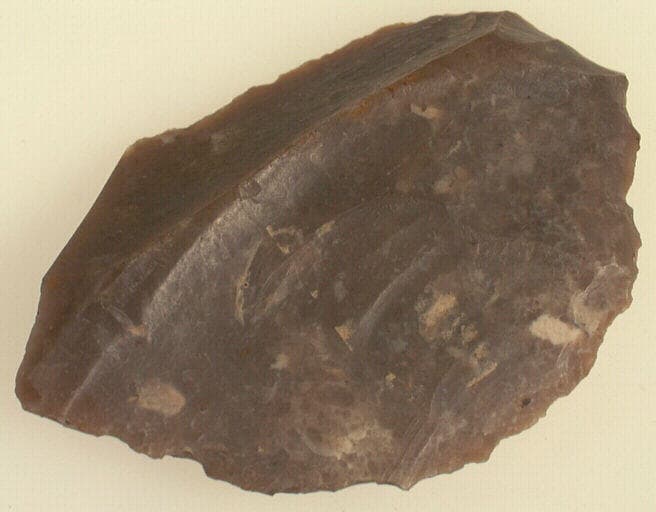 silex gris. ; Grattoir circulaire sur éclat de débitage. Talon retouché.