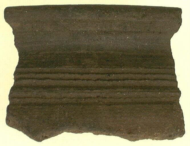 Lissée ; Fragment de bord d'un pot ovoïde. La lèvre est arrondie avec une panse décorée de cinq cannelures au minimum. La céramique est noire avec des parties plus claires, orangées, à l'intérieur. Le dégraissant est fin mais présent en grande quantité.
