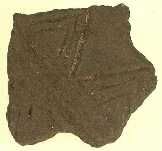 Lissée ; Tesson noir en surface et orange en coupe. Il est décoré de registres superposés de cannelures et de chevrons triples. C'est une céramique assez fine.