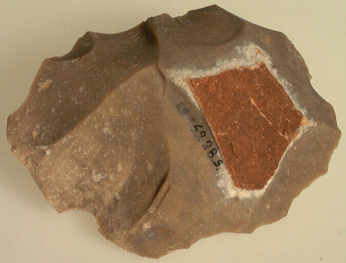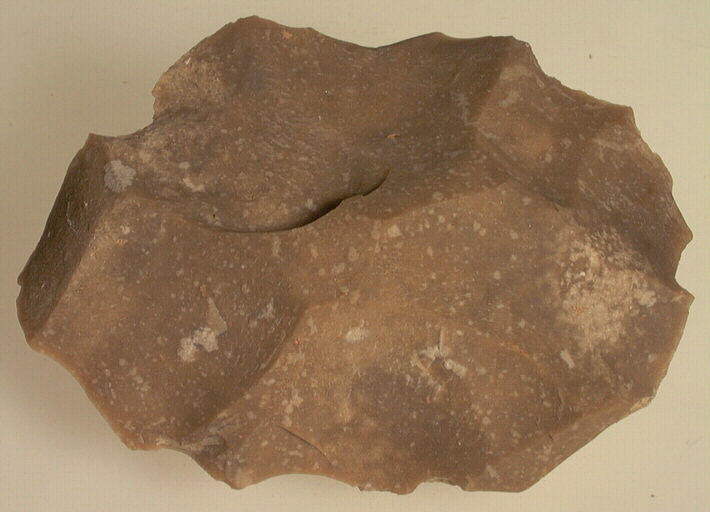 Nucléus de forme ovale, préparé pour le débitage d'éclats. Le silex est marron avec une surface couleur rouille (cortex).