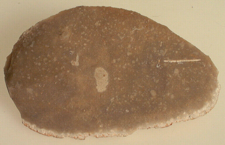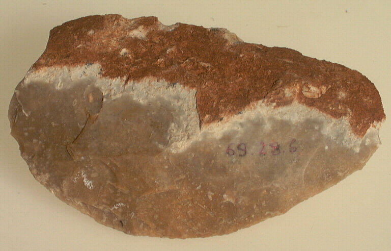 Racloir de forme ovale, dont un côté est arrondi. Le silex est marron avec une surface couleur rouille (cortex).