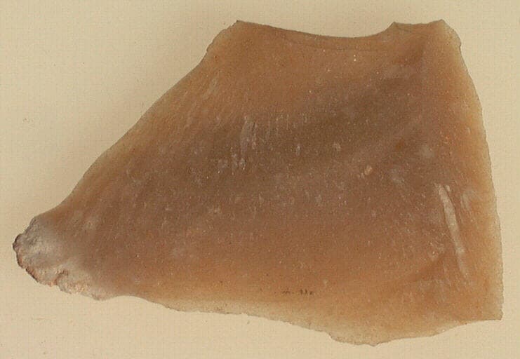 Eclat cortical de forme plus ou moins triangulaire. Le silex est marron clair avec un cortex couleur rouille.