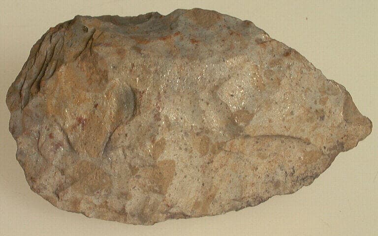 grès lustré. Il était recherché par les hommes préhistoriques, sans doute en remplacement du silex peu accessible à cette période et dont il possède les mêmes qualités clastiques. ; Biface lancéolé avec une base arrondie et une extrémité distale allongée, terminée en pointe.