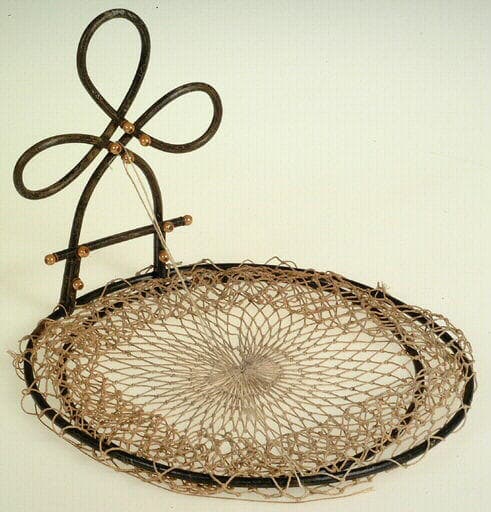 Panier noir de forme arrondie formé de deux cercles maintenant un filet. La partie qui s'accroche au mur forme une sorte de trèfle décoré de perles orangées