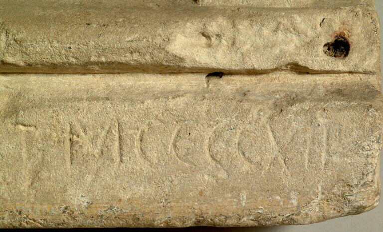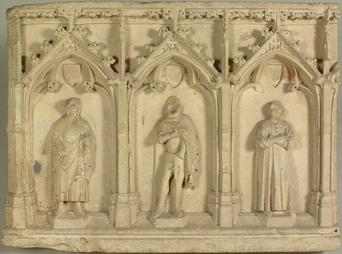 Bas-relief en pierre de lais formant la paroi latérale d'une tombe élevée et représentant trois personnages sous arcature ogivale.