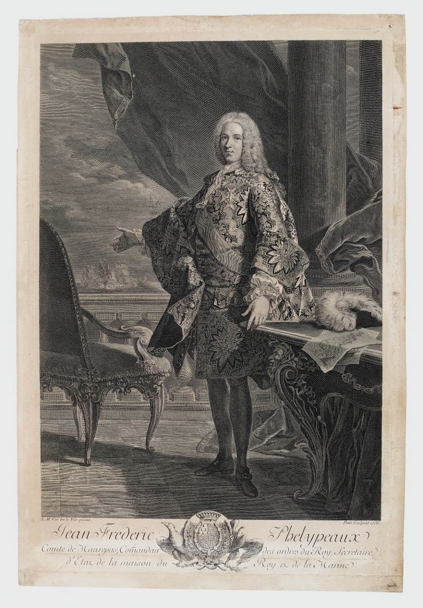 Signature de l'inventeur : L. M. Van loo le Fils pinxit. (transcription) ; b.g. ; Signature du graveur : Petit Sculpsit 1736. (transcription) ; b.d. ; Insc. concernant le modèle : Jean Frederic ? Phelypeaux / Comte de Maurepas, Comandeur ? des ordres du Roy, Secretaire / d'Etat de la maison du ? Roy et de la Marine. (transcription) ; b.c. ; Cachet : revers, b.d. ; cachet du musée de Rennes