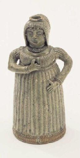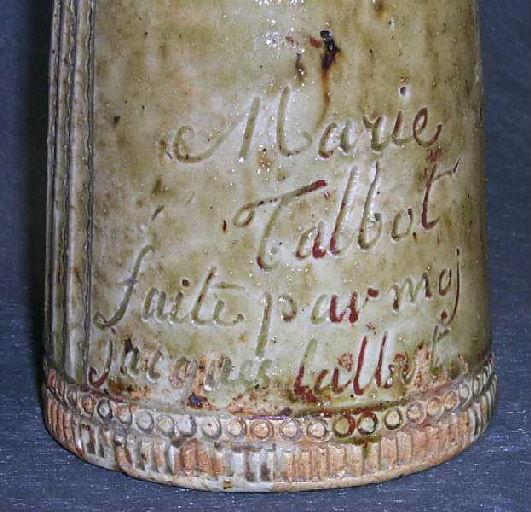 Grès, glaçure grise à l'exception de la base, laissée brute. ; La femme représentée porte un bonnet à oreillons, une robe à la taille haute très marquée et un collier à deux rangs. Ses yeux sont grands ouverts, elle porte une main sous sa poitrine, l'autre à la hanche. Cette pièce est agrémentée d'un fin décor gravé. Jacques Sébastien Talbot (qui signe ses pièces de ses deux prénoms ou seulement du premier) a signé dans le bas de la panse, à l'arrière, ' Marie Talbot / faite par moi / jacques talbot '. La femme représentée serait donc Marie Talbot (de son vrai nom : Jeanne Brûlé), fille de sa servante
