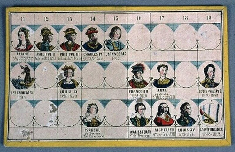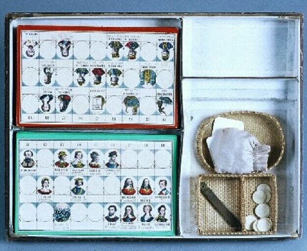 inscription concernant la représentation, signé : 'INSTRUIRE EN AMUSANT / HISTOIRE DE FRANCE / EN LOTO / Breveté S.G.D.G. / ROSENFELD / GEDALGE JEUNE / Rue Malher, 9, PARIS' (sur le couvercle, imprimé) ; inscription concernant la technique ; signé, b. : 'Imp Roche Rue Leregranie [?] Paris' (b. imprimé) ; inscription concernant la technique ; signé : 'Typ. Jules-Juteau et Cie, r. St Denis, 341 Paris' (à l'intérieur de la boîte, imprimé) ; inscription, A l'intérieur : 'Règle / de / l'histoire de France en loto / Les cartes de l'histoire de France en loto sont disposées comme celles du loto ordinaire, seulement / au lieu de chiffres, ce sont des figures représentant les principaux personnages et faits de l'histoire / de France. / Les cartons placés les uns sous les autres offrent des colonnes dans lesquelles figurent tous les personnages qui ont vécu dans le même siècle ; le numéro de ce siècle (du 11me au 19me) figure en haut de / chaque colonne. / Chaque joueur prend des cartes comme au loto ordinaire. / L'un des joueurs tire d'un sac les dés qui, au lieu de chiffres seulement, portent également le nom / d'un personnage ou d'un événement historique. / Ex. Il annonce 15me siècle, Charles VII, les joueurs portent les yeux sur le carton du haut, / s'arrêtent au 15me siècle et descendent la colonne formée par les cartons placés les uns sous les autres / jusqu'à Charles VII, qu'ils marquent d'un jeton / La partie se trouve gagnée, lorsque, comme au loto ordinaire, les 5 cases d'une ligne horizontale / sont couvertes.' (règle du jeu imprimée à l'intérieur du couvercle)