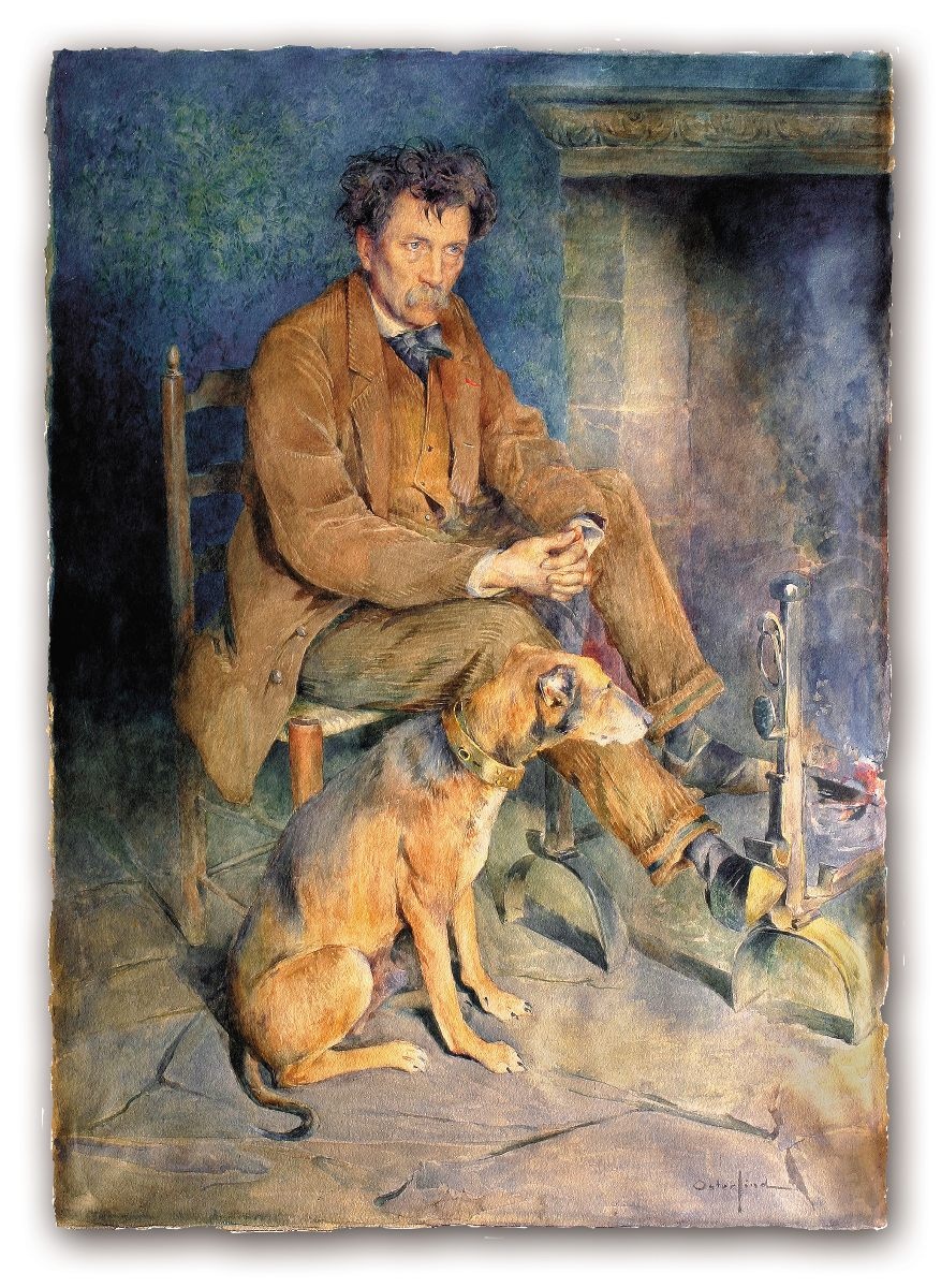 Aquarelle sur papier ; Maurice Rollinat et son chien Pluton, au coin de l'âtre à Fresselines.