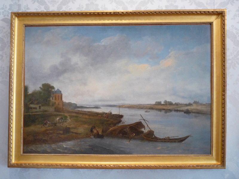 paysage (Ile-de-France, Paris, château, effet de lumière, effet de perspective, végétation, mur, buisson, personnage, homme, chemin, cheval, chargement, herbe, ciel, nuage, bateau à gaffe, bateau à voiles, barque, fleuve, Seine, marinier, tonneau)