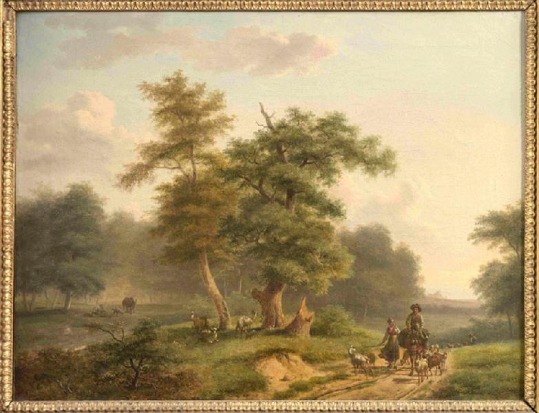 paysage (forêt, route, arbre, bergère, chèvre, mouton, cavalier, âne, transport à dos d'animal)