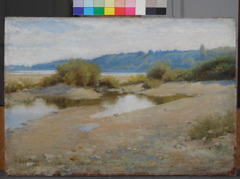 paysage (Touraine, Indre-et-Loire d, Loire, fleuve, berge, sable, végétation, arbuste, effet de lumière)