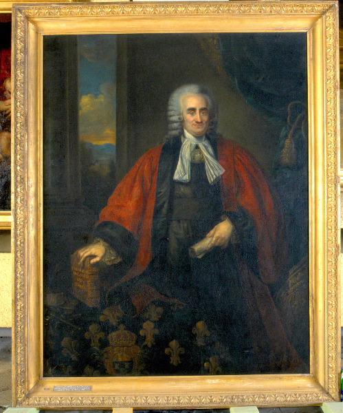 portrait (Benoist de La Grandière Etienne, Tours, homme, perruque, robe, manteau, cravate, dentelle, rouleau, livre, intérieur, rideau, draperie, fenêtre, tapis, fleur de lys, armoiries, maire) ; fond de paysage