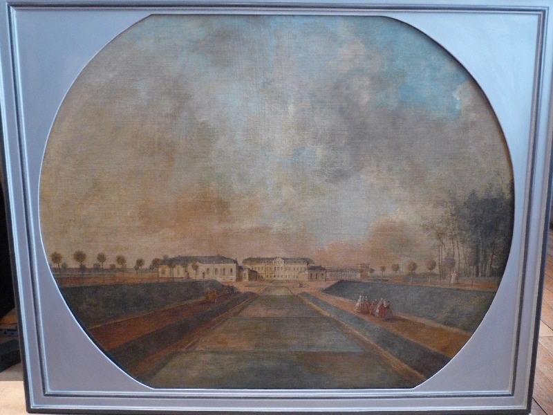 étiquette manuscrite : En bas à droite au dos du cadre : 'Vue du château de Chanteloup / par Houel - environ / 1760-1770 - mentionné / dans l'inventaire du duc / de Choiseul / Tableau réparé par J.J / [illisible]'