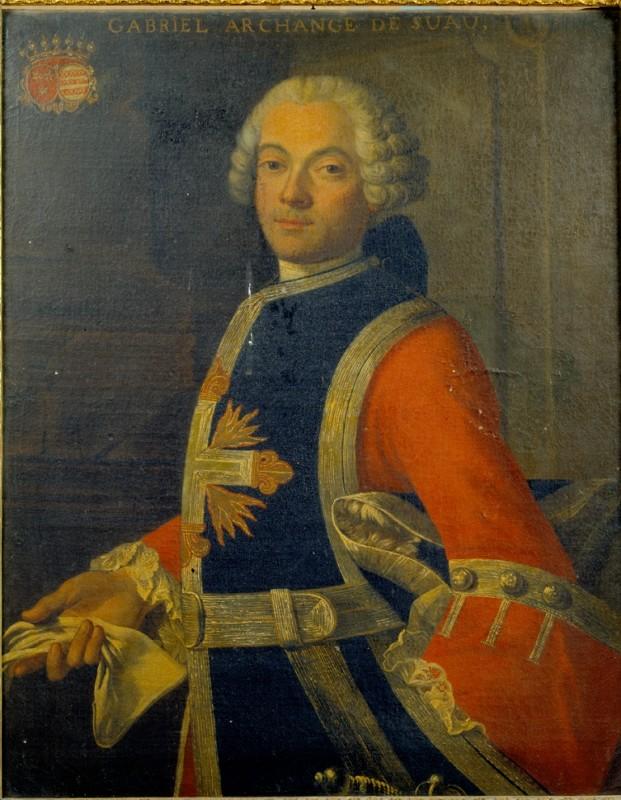 Gabriel Archange de Suau, conseiller au Parlement de Guyenne, fut également prévôt de vice-sénéchaussée de Sarlat. Les armes représentées sur ce portrait sont celles de la famille de Gabriel-Archange de Suau et de son épouse Louise-Victoire de Riencourt