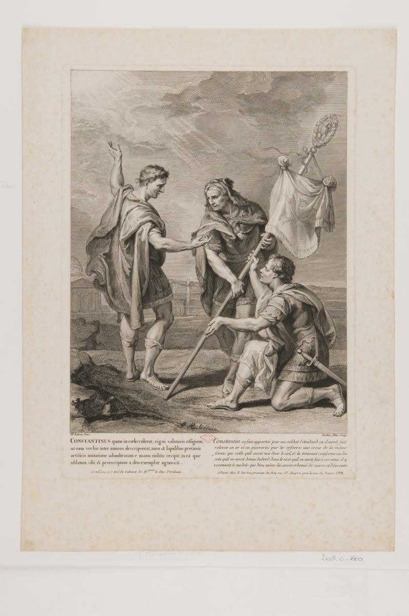 Marque de collection à l'encre : oui ; Filigrane : non ; Lettre gravée : Sous le t.c. un quatrain en latin et sa traduction française, en deux colonnes : 'CONSTANTINUS quam in coelo [...] exemplar agnoscit.//Constantin se fait apporter [...] de suivre et d'éxecuter.' et en bas à gauche :'Ce tableau est tiré du Cabinet de Mgneur. ke Duc d'Orleans.' ; Notes manuscrites sur l'ancien montage : 'd'après Rubens' ; Signature : Sous le t.c. à gauche :'PP. Rubens Pinx.' et à droite :'Tardieu filius Sculp.' et plus bas :'A Paris chez N. Tardieu graveur du Roy rue St. Jacques pres la rue des Noyesr. CPR.'
