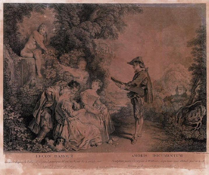 signé et daté, en bas à droite : Car Dupuis Sculp 1734 ; signature, en bas à gauche : Watteau pinx ; lettre : LECON D'AMOUR / Gravée d'après le Tableau original peint par Watteau haut de 2. pieds sur / 1 pied 6 pouces de large. AMORIS DOCUMENTUM / Scalptum juxta Exemplar à Watteavo depictum cujus altitudo pedem 2. et / latitudo pedem 1.cum 6. uncüs continet. du Cabinet de Mr de Jullienne / AParis avec privilege du Roi.