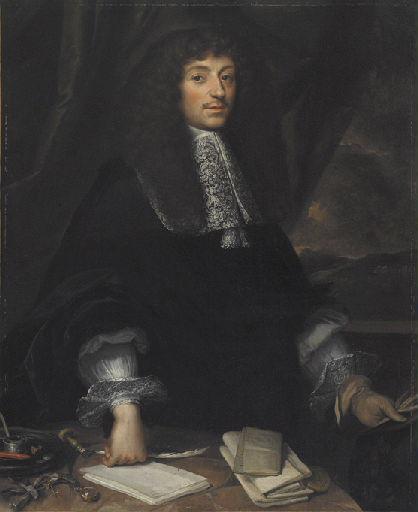 Homme de face, debout derrière sa table de travail. Perruque, habit noir, jabot et manchettes en dentelle. Sur la table: papiers, cachets, etc... sur un papier on lit le mot ' De Chaalons ce ... janvier (2) / 1668 / Mo... '