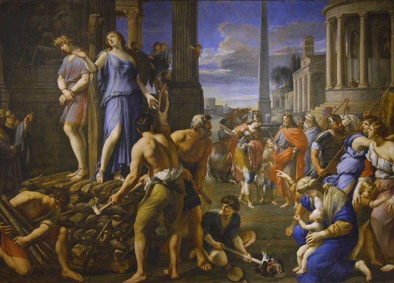 scène (Jérusalem, scène, couple, bûcher, draperie, ville, bâtiment, temple, foule, spectateur, soldat, olinde, sophronie, clorinde, roi, armure, torche)