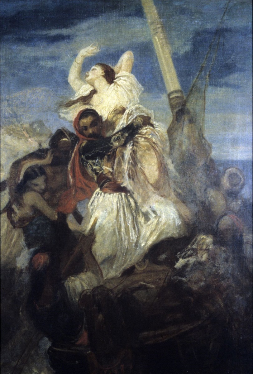 Huile sur toile ; Deux femmes sont enlevées en barque par des pirates.