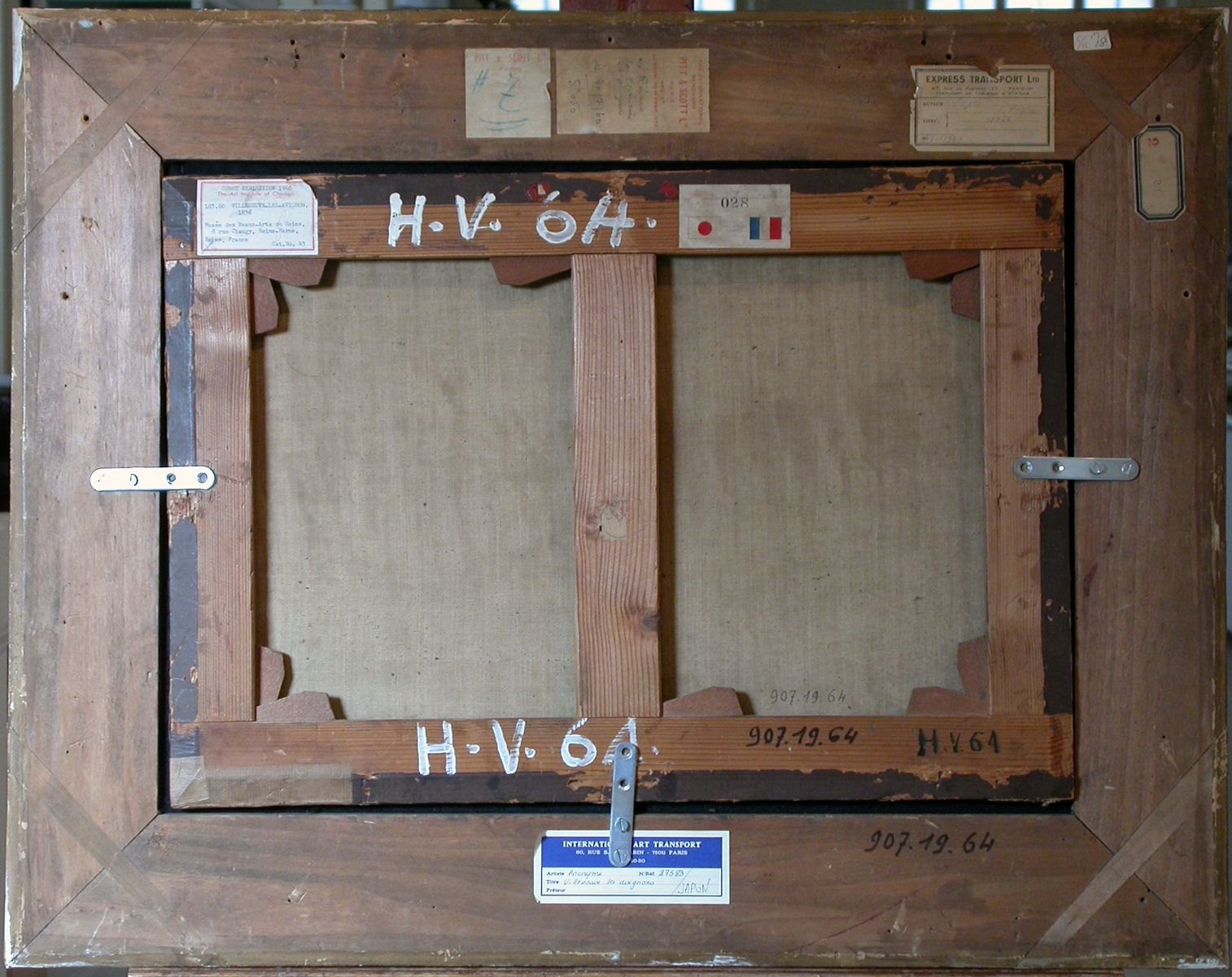 7 ; numéro, sur le cadre, au dos : en haut, au crayon noir, entouré, effacé, 9 ; marque de transit, étiquette, sur le cadre, au dos : en haut à droite, EXPRESS TRANSPORT ; numéro, étiquette, sur le cadre, au dos : en haut à droite, au crayon-feutre rouge, C/11.17 ; numéro, sur le cadre, au dos : en haut à droite, sur étiquette précédente, au crayon à bille noir, 18 ; numéro, étiquette, sur le cadre, au dos : à droite, au pochoir, 2 2[3] ; marque de transit, étiquette, sur le cadre, au dos : en bas, IAT ; marque de transit, étiquette, sur le cadre, au dos : en bas, YAMATO FINE ARTS ; marque d'exposition, étiquette, sur le châssis, en haut : à gauche, Chicago 1960 ; cachet de collectionneur, carte de visite Vasnier, sur le châssis, en haut : deux cachets à la cire rouge, carte de visite disparue [récol. 2014] ; marque d'exposition, étiquette, sur le châssis, en haut : au centre, Japon ; numéro Vasnier, sur le châssis : à la peinture blanche, à deux reprises, H.V. 64 ; numéro Vasnier, sur le châssis, en bas : à droite, à l'encre noire, partiellement masqué, H.V. 64 ; Marquage numéro d'inventaire, sur l'objet