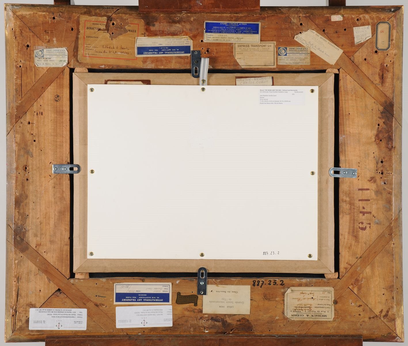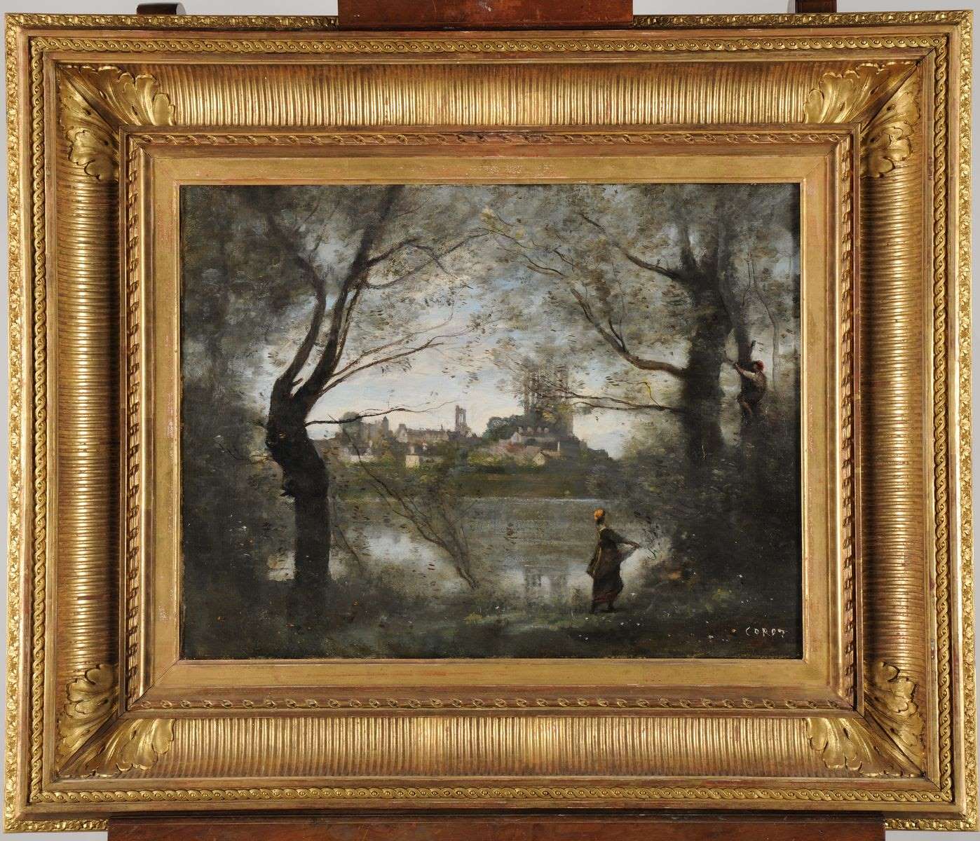 signé, en bas à droite : COROT ; marque de transit, étiquette, sur le cadre, au dos : en haut à gauche, ANDRÉ CHENUE & FILS (deux fois) ; marque d'exposition, étiquette, sur le cadre, au dos : en haut, Expo. Orangerie Tuilerie, 1936 ; marque de transit, étiquette, sur le cadre, au dos : en haut, IAT (deux fois) ; marque de transit, étiquette, sur le cadre, au dos : en haut, ANDRE CHENUE ET FILS ; marque de transit, étiquette, sur le cadre, au dos : en haut, EXPRESS TRANSPORT ; marque d'exposition, étiquette, sur le cadre, au dos : en haut, RMN, Orangerie 1975 ; inscription concernant la restauration, étiquette, sur le cadre, au dos : en haut à droite, avec mention au crayon à bille, M.P.R. 6306 / REIMS / CAMILLE / COROT / MANTES / [...] ; cachet, numéro, étiquette, sur le cadre, au dos : à l'encre, 2 / 13 ; annotation, sur le cadre, au dos : en haut, au crayon bleu, illisible ; annotation, sur le cadre, au dos : à droite, au crayon noir, illisible ; numéro pochoir rouge, sur le cadre, au dos : à droite, 1145 ; annotation, sur le cadre, au dos : en bas, au crayon noir, Musée de Reims ; marque de transit, étiquette, sur le cadre, au dos : en bas, MICHAUX & GUÉRIN ; cachet de douane, sur le cadre, au dos : en bas, douane française ; marque d'exposition, étiquette, sur le cadre, au dos : en bas, Liège 1939 ; marque de doreur, étiquette, sur le cadre, au dos : en bas, ATELIER SHAEFER ; marque d'exposition, étiquette, sur le cadre, au dos : en bas, LP ART (deux fois) ; cachet de douane, sur le cadre, au dos : à gauche, douane suisse ; marque d'exposition, étiquette, sur le châssis, en haut : à gauche, Berne 1960 ; inscription concernant la restauration, étiquette, sur le châssis, en haut : à droite, au crayon à bille, M.P.R. 6306 REIMS / CAMILLE COROT / [illisible] ; marque d'exposition, étiquette, au dos, en haut à droite : sur le carton plume, Edimbourg ; cachet du fournisseur, sur la toile, au revers : masqué lors de la restauration [récol. 2014] ; cachet de douane, sur la toile, au revers : masqué lors de la restauration [récol. 2014] ; Marquage numéro d'inventaire, sur l'objet