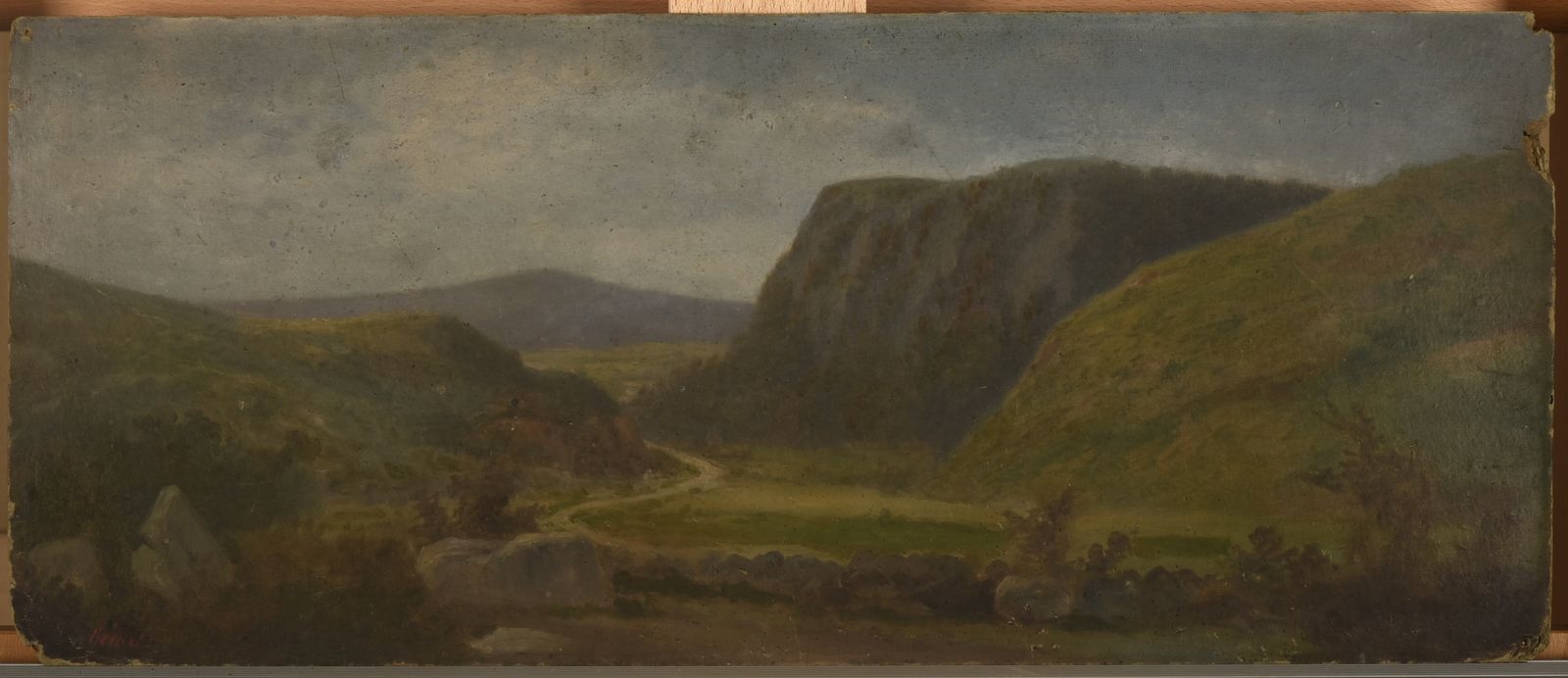 Huile sur carton ; Chemin serpentant au milieu d'une petite plaine environnée de collines.