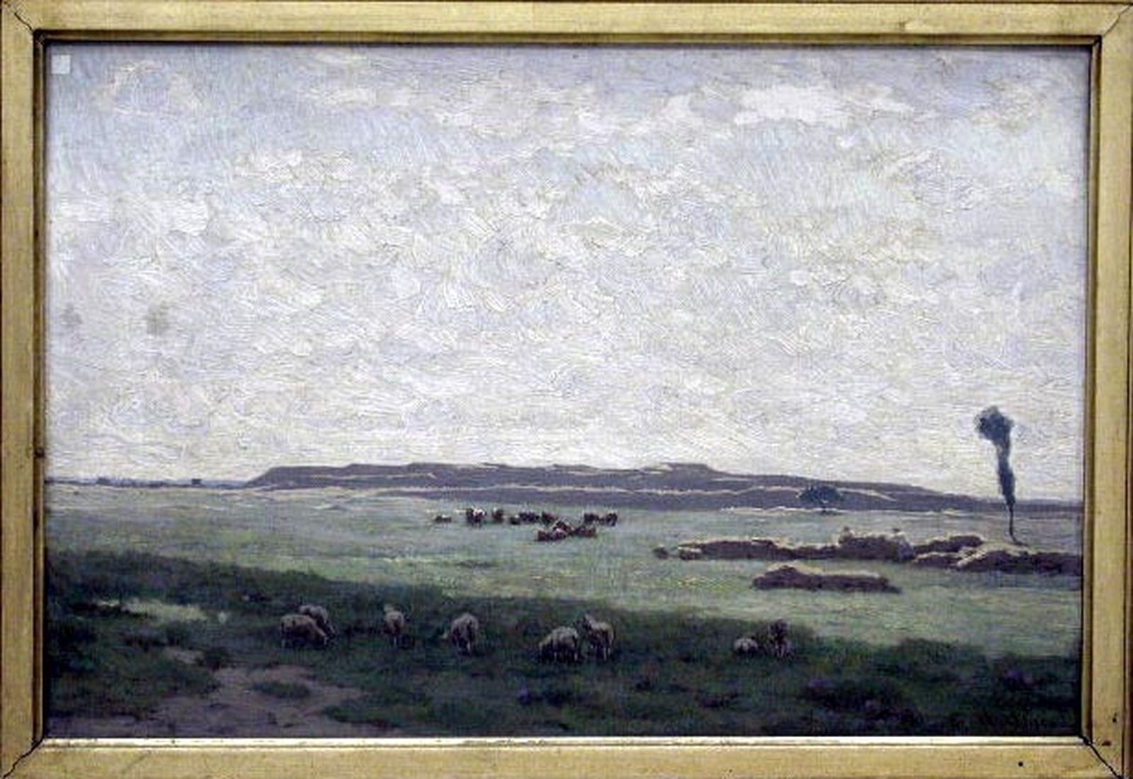 Huile sur toile ; Paysage, grande plaine devant le fort, avec moutons.