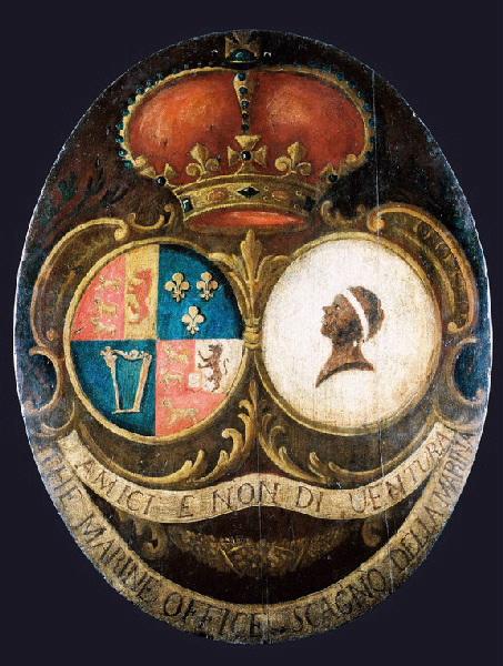 Symbole de souveraineté anglo-corse, ces armoiries regroupent les armes du Royaume uni et celles de la Corse. La devise 'Amici non di ventura', extraite de la Divine Comédie (Enfer) de Dante, a été prononcée par le vice-roi sir Gilbert Eliot à l'occasion d'un discours scellant l'avènement du nouveau régime. Elle devient alors la devise du royaume anglo-corse (1794-1796). Ce panneau était vraisemblablement l'insigne des bureaux des affaires maritimes situées alors sur le Vieux Port de Bastia.