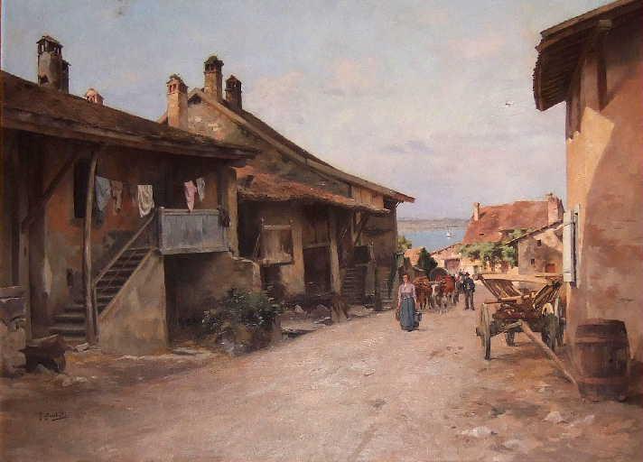 vue d'architecture (Haute-Savoie d, Yvoire, village, maison, rue, charrette, personnage)