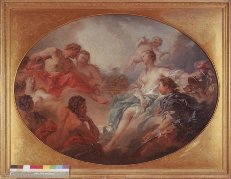 scène mythologique (allégorie : présentation, apothéose, Vénus, Enée, Diane, Jupiter, Vulcain, Junon, Bacchus, Eros, foudre, nuage, marteau, arme, aigle, colombe, putto)