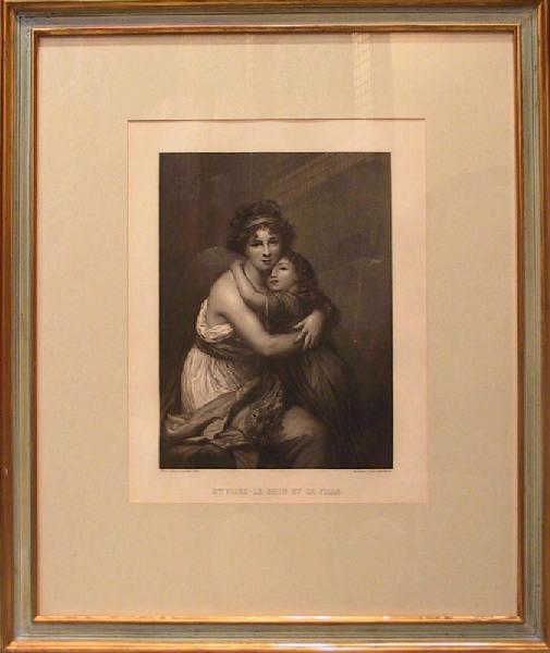inscription donnant l'identité du modèle, En bas au centre : MME. VIGEE-LE BRUN ET SA FILLE ; inscription concernant l'auteur, En bas à gauche : MME. LE BRUN (L.E. VIGEE) PINX. ; inscription, En bas à droite : MASSARD (JULES) 1880 SCULP