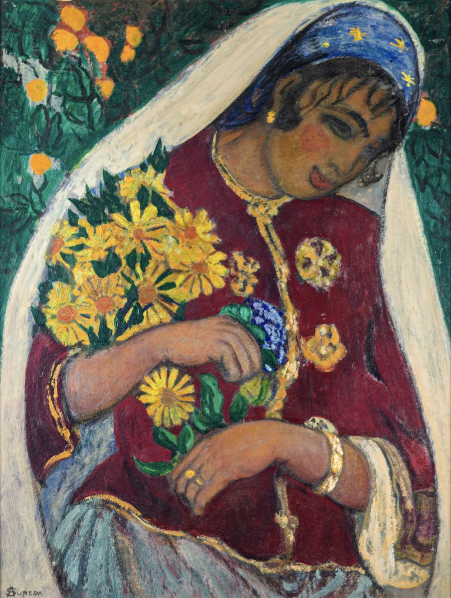 portrait (femme, en buste, marguerite, bouquet, fleur, foulard, voile)
