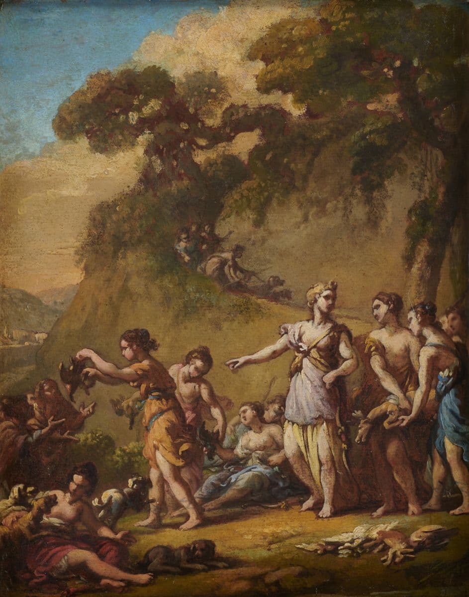 On aperçoit Diane au retour de la chasse qui ordonne à ses serviteurs de distribuer le gibier aux bergers. Dans cette composition en frise, habilement modulée, qui se déroule de gauche à droite, sur un fond de paysage, les figures drapées à l'antique, les tons froids annoncent en effet, le style néo-classique qui fait suite au style 'rocaille'