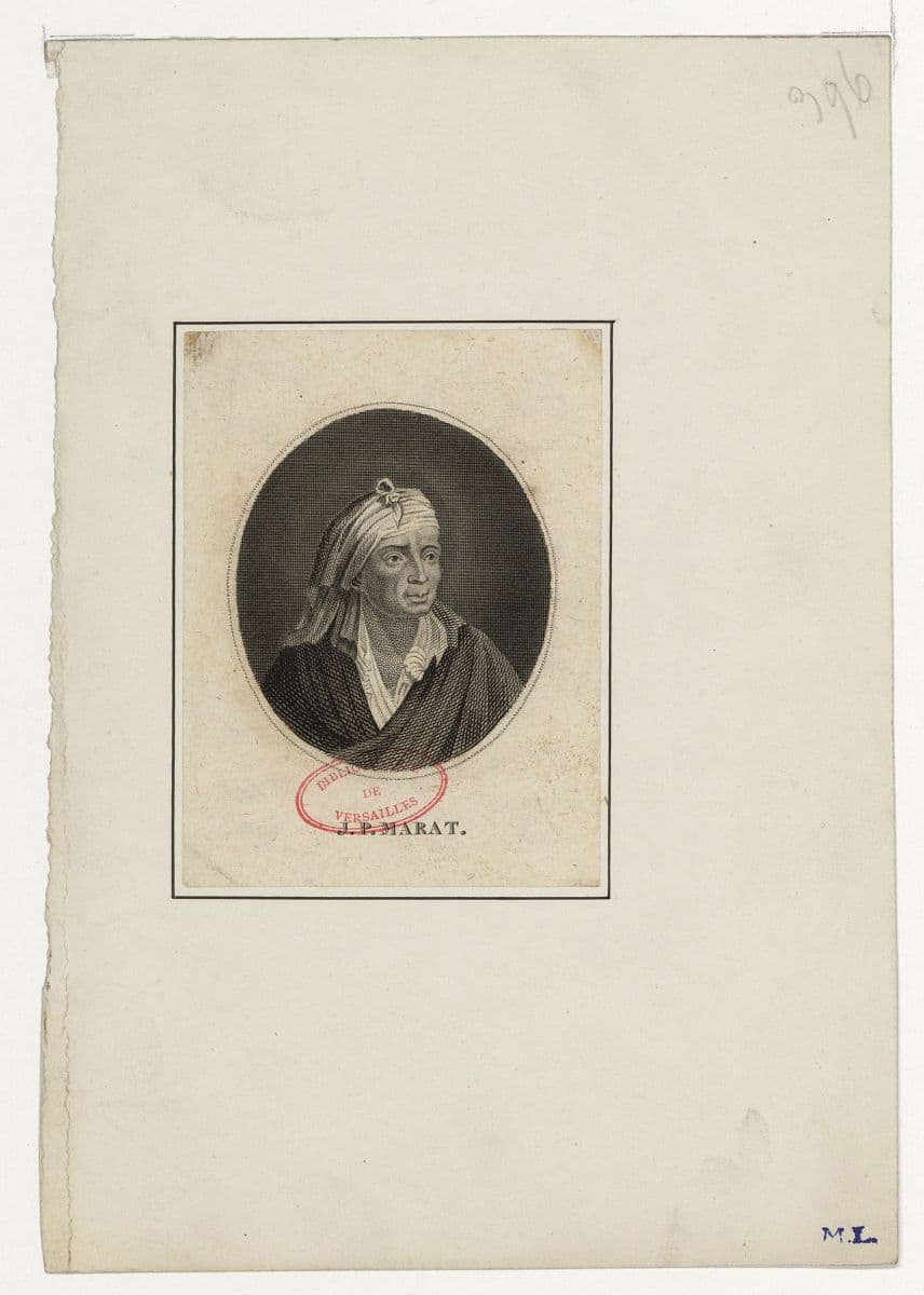 "396" (En haut à droite) ; "BIBLIOTHEQUE DE VERSAILLES" (Au milieu) ; "J.P. MARAT." (en bas) ; "ML" (En bas à droite)