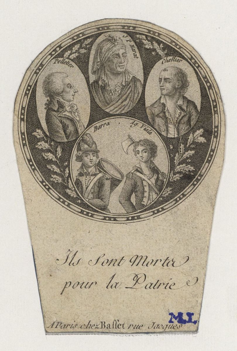 Quatre médaillons représentant : Jean-Paul Marat, Louis-Michel Lepeletier de Saint-Fargeau, Marie-Joseph Chalier, Joseph Barra et Joseph-Agricol Viala.