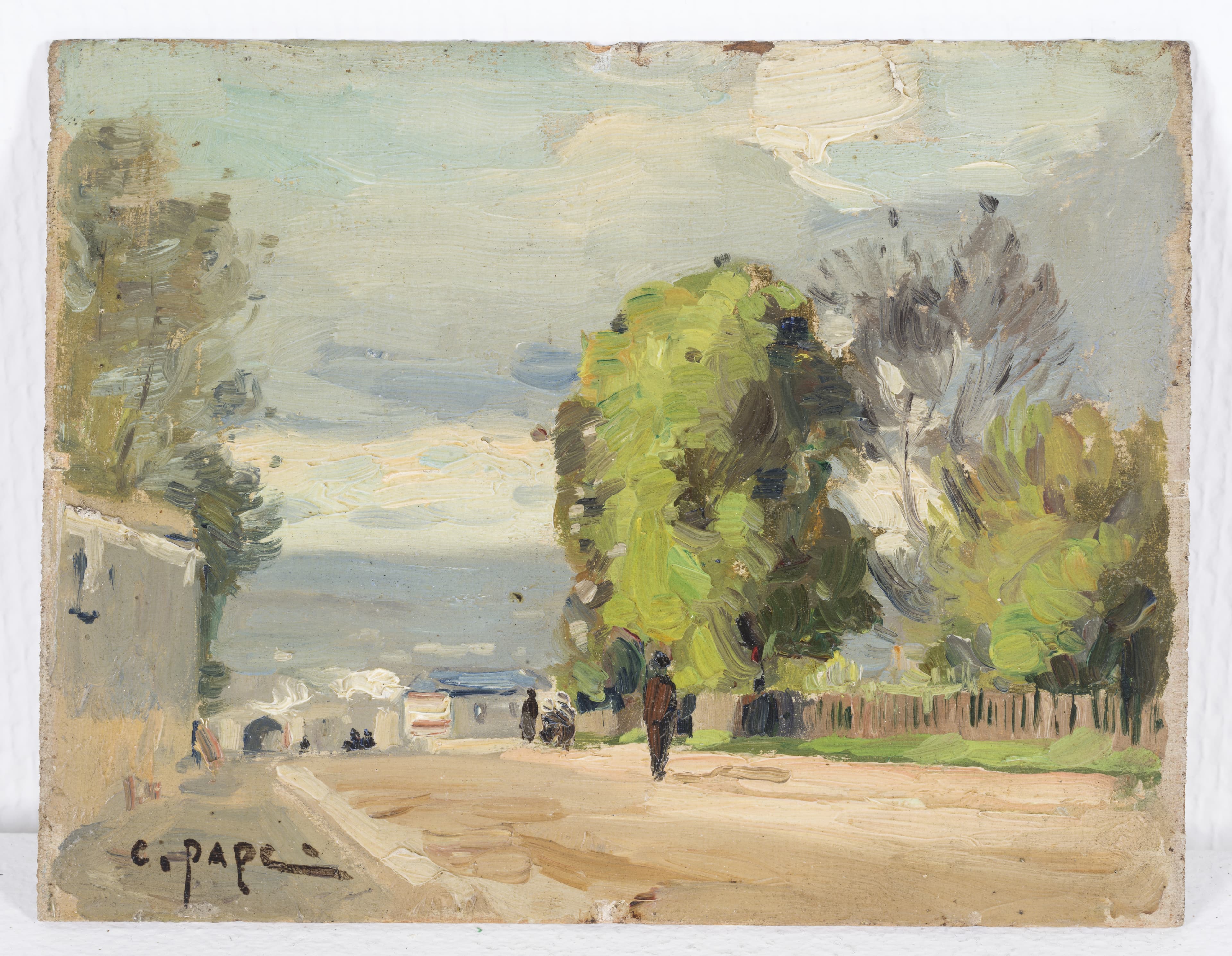 Constant Pape a réalisé de nombreuses huiles sur bois, dans un immuable format de 14 x 18 cm. Nombre d’entre-elles portent la marque de son habituel fournisseur de toiles et de couleurs, la Maison Blanchet. Cette dernière commercialisait également des chevalets portatifs permettant de glisser les panonceaux dans des rainures adaptées; les différents compartiments abritent la peinture, les pinceaux et une palette. Ainsi, les peintres pouvaient facilement aller peindre «sur le motif» ou «sur le vif», c’est-à-dire directement face à leur sujet. Ces panonceaux représentent tous des sujets éminemment locaux : les rues de Meudon, de Clamart et d’Issy-les-Moulineaux proches de son domicile et généralement bien identifiées à l’encre ou au crayon au revers de l’œuvre. La ville de Clamart conserve trente-deux de ces petits paysages, protégés au titre des monuments historiques, tandis que vingt-cinq autres sont présents dans les collections du Musée d’art et d’histoire de Meudon. D’autres encore sont conservés en main privée. On peut raisonnablement estimer que Constant Pape a peint plus d’une centaine de ces petites peintures destinées à être offertes ou vendues à des proches. Il apparaît difficile de les qualifier exactement. Il ne s’agit pas d’esquisses à proprement parler, nous ne retrouvons pas en effet de peintures de plus grand format reprenant strictement les mêmes motifs, mais elles semblent aussi plus abouties que de simples pochades, ces petites œuvres pleines de verve, exécutées rapidement par les peintres pour saisir une impression. Très fraiches, évocatrices d’un paysage urbain à la présence humaine limitée, ces œuvres démontrent la capacité de l’artiste à saisir, dans des saisons et des lumières différentes, un nombre restreint de motifs. La peinture à l’huile y est appliquée sans préparation et le support de bois apparaît volontairement en réserve à certains endroits.