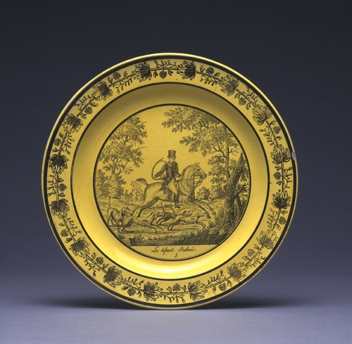 Assiette représentant la chasse à courre. La scène occupe le fond de l'assiette. Elle porte le n° 5 : " Le défaut relevé". Sur l'aile, ruban à la grecque s'enroulant autour d'une tige fleurie ; Notice 53 : Onze assiettes (plus une en double) d'une série de douze consacrée à la chasse à courre, en faïence fine jaune à décor imprimé noir. Les différents épisodes de cette chasse sont représentés par des scènes occupant tout le fond de l'assiette et portant les légendes suivantes : - 1 Les apprêts - 2 Le départ - 4 Le cerf lancé - 5 Le défaut relevé - 6 Le tir à cheval - 7 Le défaut - 8 La résistance - 9 Le rameuté - 10 Le cerf aux abois - 11 Le repos - 12 Le retour Comme on le voit, il manque le n°3. La douzième assiette est un double du n°1. A l'aile, fleurs de houblon stylisées. Diam. 0,216. Marque en creux dans un écusson P et H CHOISY et un numéro qui n'est pas le même sous toutes les assiettes. Trois d'entre elles portent le n°7. Une le n°8. Trois le n°18. Une le n°19. Deux le n°20. L'un a ce n° illisible. Les deux assiettes qui représentent la même scène portent, l'une le n°8, l'autre le n°20.