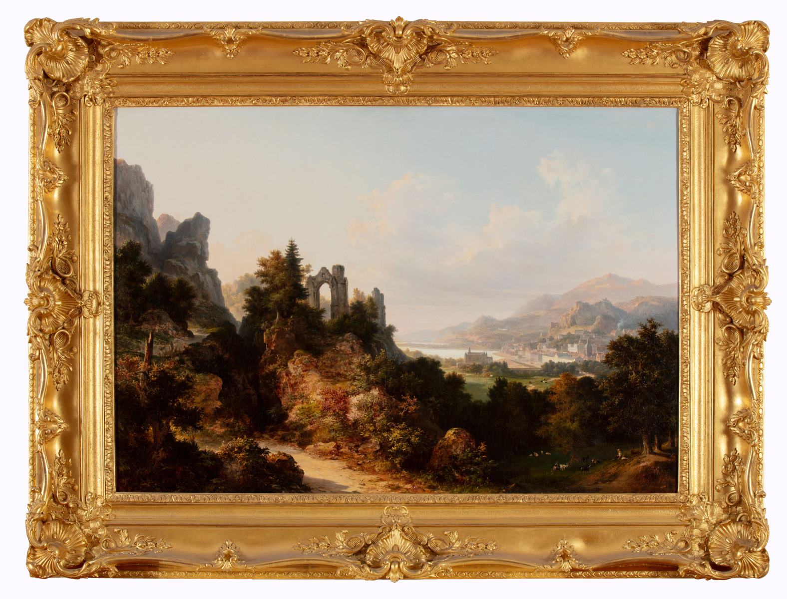 Paysage représentant au premier plan l'orée d'une forêt avec une église en ruine. A l'arrière-plan, on distingue une petite ville avec plusieurs églises au bord d'un lac.