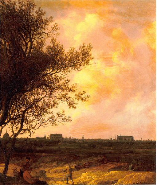 Paysage panoramique dont la profondeur est soulignée par un horizon plat et très bas et par la verticale puissante de l'arbre qui envahit le premier plan à gauche. Sous celui-ci, trois hommes se reposent au bord d'un chemin longeant une vaste plaine monotone. Un villageois chemine. Les profils de la ville se dessinent sous un vaste ciel délicatement nuageux. La gamme de terres presque monochromes et le pinceau peu chargé aux lavis translucides, rattachent cette peinture à l'école de Van Goyen.