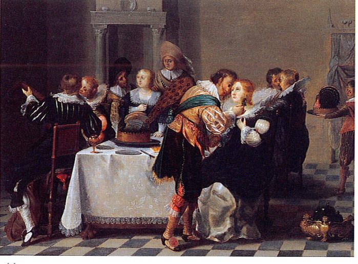 Dans une salle au dallage noir et blanc et autour d'une table recouverte d'une étoffe de damas blanc, une joyeuse compagnie s'adonne aux plaisirs des sens. Quatre couples, élégamment vêtus, boivent ou jouent de la musique tout en se courtisant. Devant la cheminée au linteau supporté par deux colonnes corinthiennes, un homme debout reste seul tandis que sur la gauche surgissant d'une porte un petit serviteur présente sur un plat un somptueux dindon.