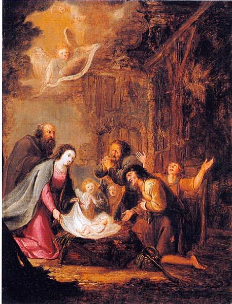 Dans une construction frustre, brossée rapidement, la Vierge, saint Joseph, deux petits anges radieux et trois bergers entourent l'enfant Jésus. Au dessus de l'enfant rayonnant dans une trouée du toit, un ange apparaît sur un fond lumineux tenant un phylactère. Seuls le manteau vert de la Vierge et sa robe rouge l'isolent ainsi que son fils du reste des protagonistes, tous dans des teintes de terre qui les différencient à peine de la masure. Le traitement de ces petits personnages bibliques, et les coups de brosses rapides de l'étable rappellent la manière de Rembrandt dont Wet fut l'élève et prouvent ainsi l'influence déterminante du maître.