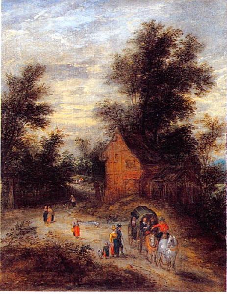 Dans un paysage verdoyant de petits personnages s'activent. Au premier plan, un chariot est à l'arrêt et le postillon discute avec un couple accompagné d'un chien et d'un enfant. Une femme nourrit ses poules, au loin deux cavaliers cheminent. La levée de terre brune du premier plan sert de repoussoir à la scène principale en pleine lumière. Cependant la composition semble déséquilibrée et ne répond pas aux grands principes de la composition flamande ce qui est confirmé par le fragment de lointain bleuté visible à droite, mais sans suite puisque le tableau est là sectionné comme l'atteste les bords de la toile
