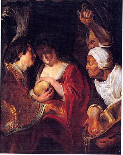 Cadrage resserré, personnages vu à mi- corps dans un espace confiné, éclairage ténébrosiste qui souligne les visages des 4 personnages : l'ange, Marie- Magdeleine, la tentatrice (entremetteuse) et l'Envie. Si l'influence caravagesque est évidente, la gamme chaude des coloris qui joue sur les différentes tonalités de rouges, reste elle bien flamande. Défendue par l'ange, la Magdeleine tient un crâne dans ses mains et regarde en souriant les bijoux que lui proposent la vieille femme, à sa gauche. Derrière celle-ci la figure grimaçante de l'Envie brandit un serpent. Le côté lisse et appliqué de la peinture dénonce la copie dans le même sens du tableau bien connu de Jordaens conservé au musée des beaux- arts de Lille.