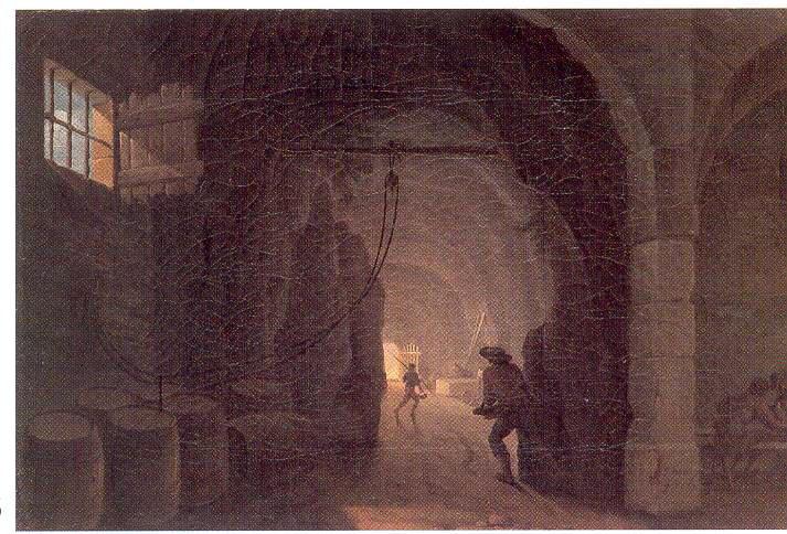 La vue est celle d'une réserve ou d'un magasin à fourage aménagé dans une grande cave consolidée par des voûtes. Un soupirail, à gauche, éclaire parcimonieusement le premier plan alors qu'au fond, à l'arrière plan, la lumière rayonne. A droite deux hommes dont l'un est coiffé d'un tricorne sont attablés et semblent boire. La silhouette d'un troisième portant un panier se découpe à contre-jour et enfin un quatrième s'apprête à sortir muni d'une longue gaffe.