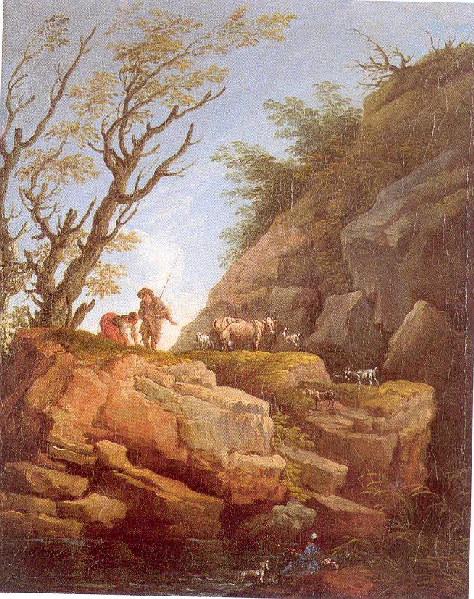 Le paysage de grands rochers est animé de trois personnages. Au premier plan, une femme vêtue d'une robe bleue et assise au bord de l'eau semble pêcher avec son petit chien à ses côtés. Sur les roches qui surplombent le ruisseau encaissé, un couple se dessine sur le ciel, elle à genoux lui dresser avec l'habituelle gaule de bois en main, non loin d'eux une vache, un mouton, deux biques et un chien occupent les différents rochers en étage. A gauche, les branches d'un arbre en partie dénudées s'élancent dans le ciel.
