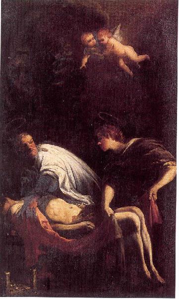 Scène ténébreuse, les 3 protagonistes sont massés dans la moitié inférieure de la composition. Au 1er plan dans l'angle gauche un gril renversé évoque le martyre de saint Vincent, le corps livide de celui-ci barre horizontalement l'ensemble. Il est porté par l'artifice d'un drap rouge par un saint auréolé (?) qui soutient les jambes et un diacre à dalmatique blanche et barbe blonde (?) qui soutient le buste. Dans le ciel à droite, deux angelots dont l'un montre la scène.