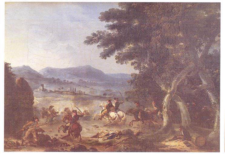 scène historique (bataille, soldat, Français, Espagnol, cavalerie, cavalier, cadavre, cheval) ; fond de paysage
